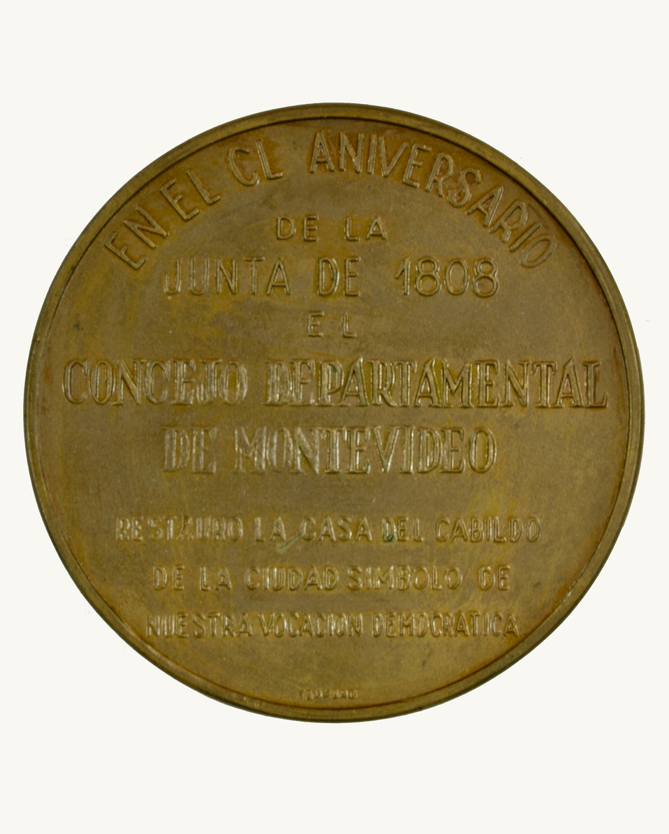 | metadata.dc.description.note: | Anverso: Fachada del Cabildo. Borde superior, "Cabildo abierto". Borde inferior, MDCCCVIII - MCMLVIII". Firma, "Tammaro". Reverso: Borde superior,"En el CL aniversario"; al centro, "De la Junta de 1808 el Consejo [sic Consejo] Departamental de Montevideo restauró la casa del Cabildo de la ciudad símbolo de de nuestra vcación democrática". Firma, "Tammaro". |