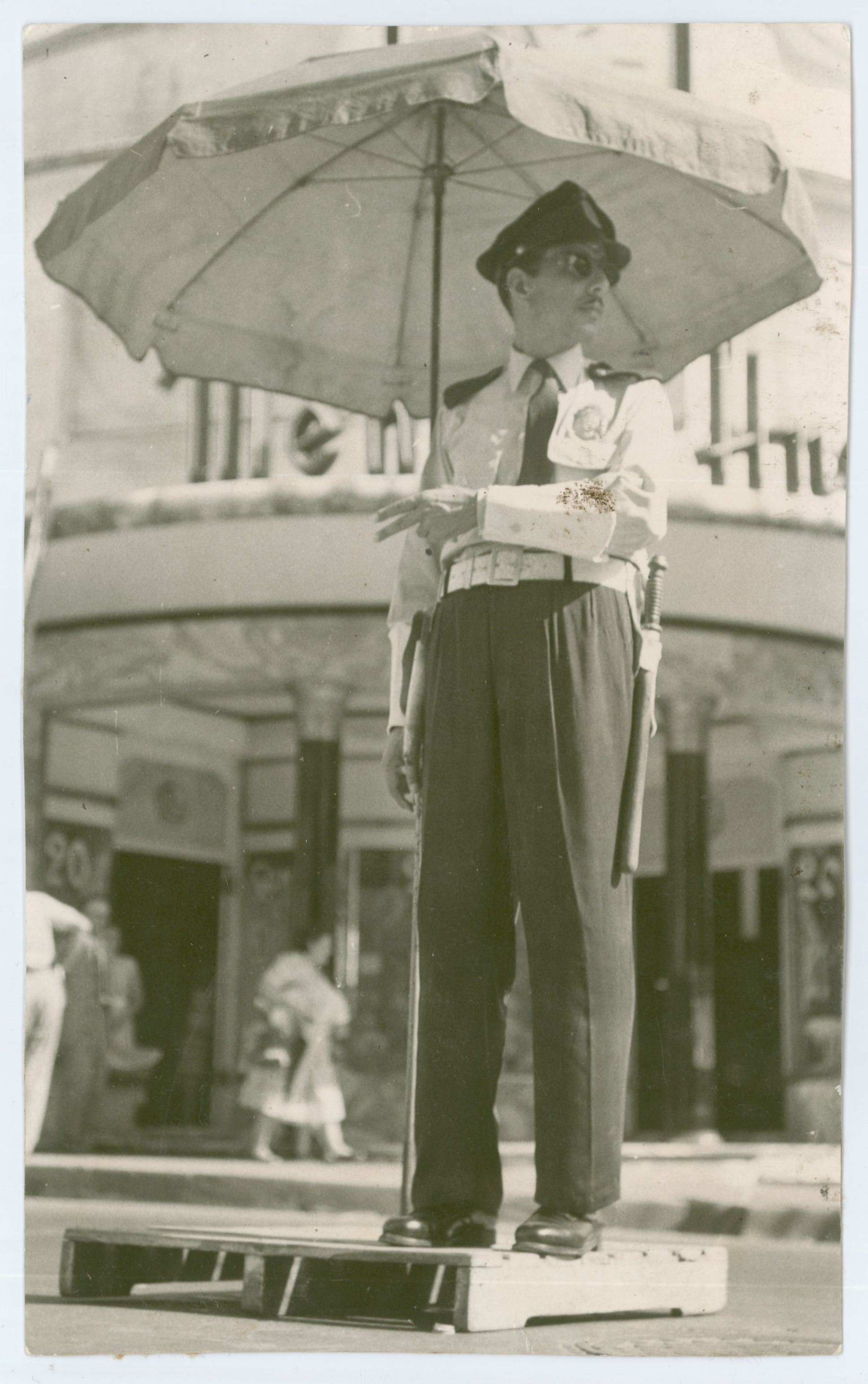 | Título : | Agente de tránsito bajo una sombrilla en plena canícula |